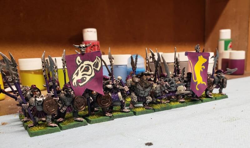 The rat shields turned out perfect. My kid helped me with them. We used a UV resin molding and casting kit from the craft store. It wasn't cheap, but considering that it yielded 25 shields, and still has a lot of resin left for future projects, I think it was definitely worth it. My kid made the mold from one of the original GW rat shields. The resin is in a medicine dropper style bottle, and it is very easy to control the exact amount of liquid dispensed into the mold. It cures very quickly when exposed to UV light from the little flashlight included in the kit. The detail is crisp, and the shields painted very well. I'm happy with them, but I think I will go back and highlight the rat heraldry with gold just to make it pop a little more.