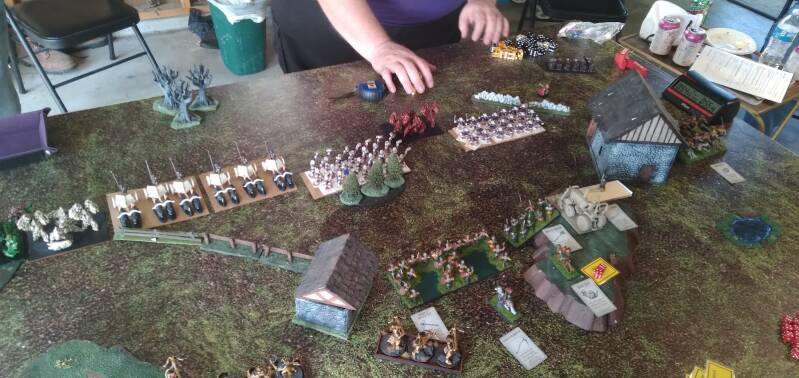 So an hour after purchasing Katz's Ratz, they were being arranged on hastily cut out cardboard unit bases and getting deployed in an alliance with dwarves and golems. I used the Mantic Companion app to throw together a terrible army list in less than thirty seconds, borrowed dice and a tape measure, and commenced to battle. We lost against the Halflings and Ogres, but it was a great game nonetheless!