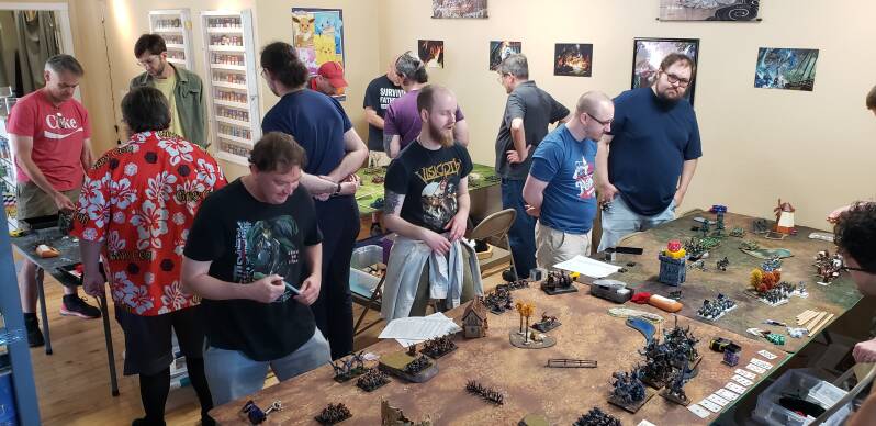 The First Annual Interstate Doubles Tournament was held at Three Mountain Games in Reedsburg WI, which is a great halfway point for the two gaming clubs. Three Mountain isn't a very big store, but that's ok. Because this was a doubles tournament, it meant that we would have four players at each table each round, so for our 16 player tournament, we only needed four tables! Everyone had a great time and made lots of new friends. The store owners were wonderful hosts, and we had great prize support from Mantic Games. Lunch was catered by Pizza Ranch, and everyone had as much fried chicken and pizza as they could eat. Two of the Minnesota players showed me how to organize pairings and score the tournament as we went. The whole thing went as smoothly as we could have hoped for and was altogether a wonderful experience! Thanks to my friends in the Wisconsin and Minnesota KoW communities for making my job as a tournament organizer so easy, and thanks to Three Mountain Games for hosting us. I'm excited to finally bring Kings of War tournaments to Wisconsin!